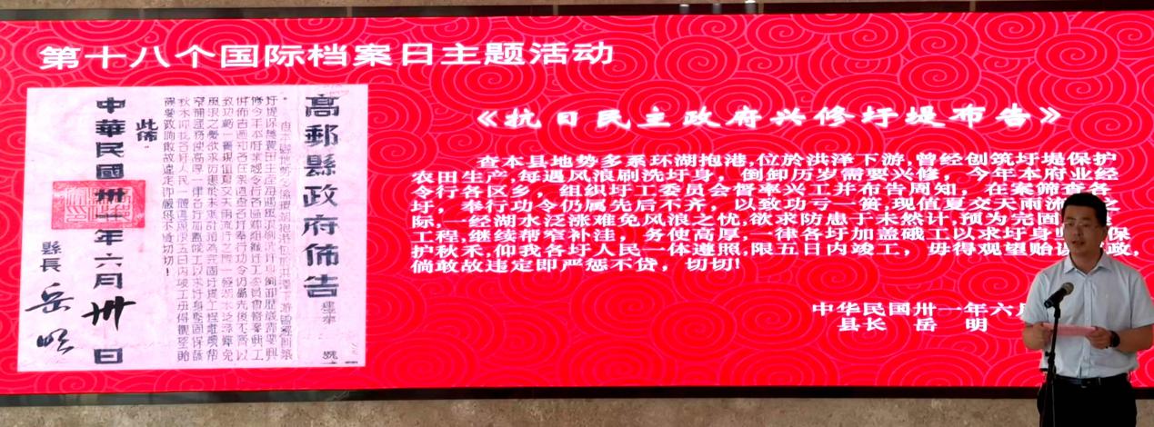 联合公布人——金湖县水务局副局长刘飞公布1942年开放档案《抗日民主政府兴修圩堤布告》,这份档案记录了抗战时期中国共产党领导人民治水抗灾的生动实践,展现了中国共产党以人民为中心的执政理念,是重要的抗战时期水利档案。