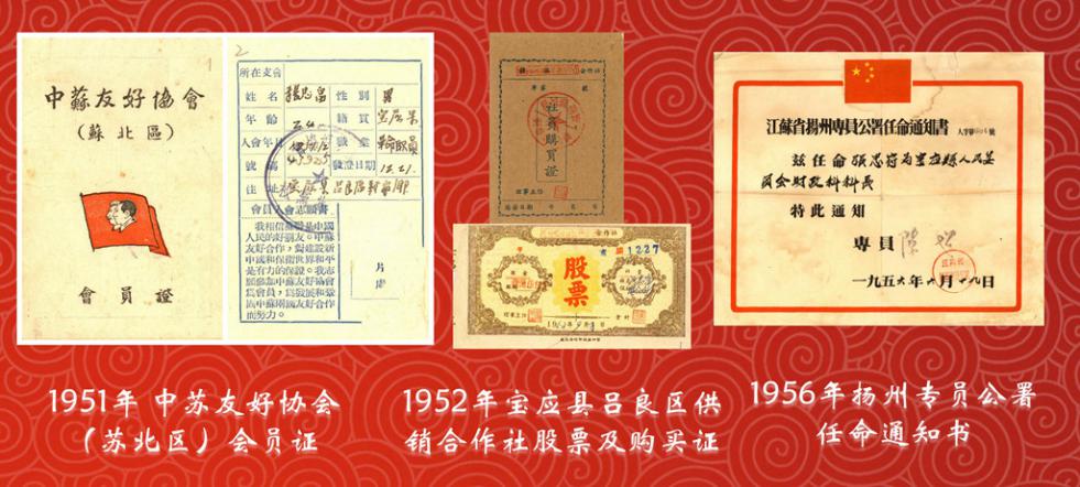 金湖县人大常委会原副主任张小平捐赠档案史料52件,其中捐赠的1951年中苏友好协会会员证、宝应县吕良区供销合作社股票、扬州专员公署任命通知书等档案,反映了金湖县筹建前后的历史。