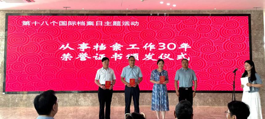 一代又一代的档案工作者在岗位上默默奉献,薪火相传。他们用青春、用汗水去维护历史的真实面貌。淮安市档案馆副馆长张宝权为三位从事档案工作30年档案人员代表颁发由国家档案局、中央档案馆授予的荣誉证书。