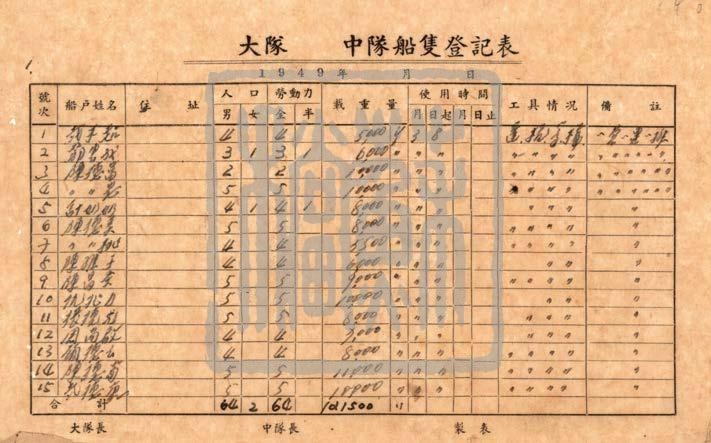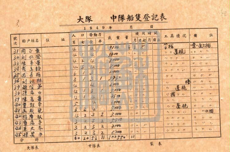 内容与评价:1949年2月13日,中共华中工委成立渡江准备委员会,统一一切渡江工作的领导,包括情况侦查、粮食南运、船只准备、民工调度等等。下设渡江船只管理局,对筹集来的船只进行检查、分类、维修、训练、调度。华东野战军司令员陈毅曾深情地说:“淮海战役的胜利,是人民群众用小车推出来的。”其实何止小车?人民群众贡献了后勤所需要的,包括牛马车船在内的一切。登记表中记录了船户姓名,家庭劳动力情况以及船只情况。70 多年间物是人非,但当年那一个个勤劳勇敢的名字却长留在档案中,成为我们宝贵的精神财富。