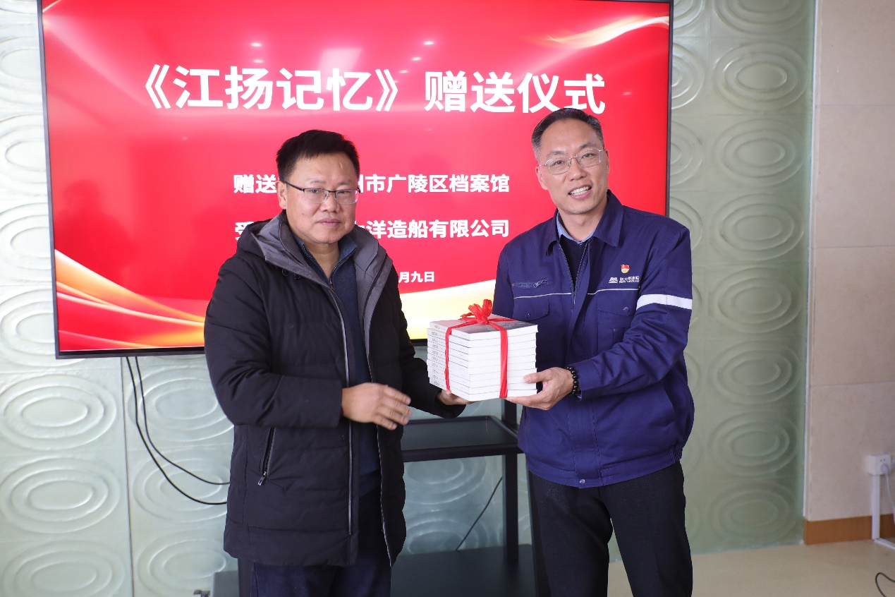 1月9日,扬州市广陵区档案馆在新大洋造船有限公司举行《江扬记忆——江扬集团风雨历程的岁月留痕》赠书活动。新大洋造船有限公司副总经理陈鹤荣,副总经理、工会主席金文刚,总经理顾问赵家林,副总经理戚桂飞,《江扬记忆》作者、原江扬船舶集团纪委书记汤国庆出席捐赠仪式,广陵区档案馆馆长、党史办主任、四级调研员周冠钧,副馆长董坚,以及其他相关同志参加活动。