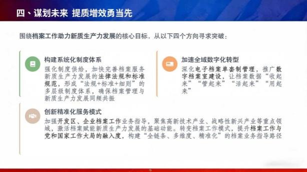 会议要求,“业务能力焕新年”的重点是在创新上下功夫,对“十五五”时期档案工作的新目标、新任务、新方向进行研究、探索和突破。充分运用省数字档案馆建设成果和档案数字化成果,开展“人工智能+档案”新课题研究,进一步明确业务焕新路径。学会摸着石头过河,不断推进人工智能在数字档案室、馆际交互、档案移交接收、档案质量检测、智能开放审核、智能检索、智慧查档、智能编研、智能楼宇、网络档案学院、档案掌上宝等多场景的应用建设。坚持做实功、求实效,将业务能力焕新落到实处,哪怕突破再小,只要坚持不懈,就能聚沙成塔、汇涓成海,真正为发展大局创造价值、为人民群众带来福祉。
