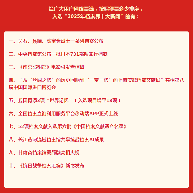 2025年12月24日,中国档案报社启动“你心目中的档案界十大新闻”网络票选活动,全国各地档案部门积极响应和支持,共有1.7万人次参与。经网络票选,南京市档案馆的两篇新闻报道:“吴石、聂曦、陈宝仓烈士一系列档案公布”“《南京照相馆》电影引发查档热”分别获得“2025年档案界十大新闻”第一名和第三名。