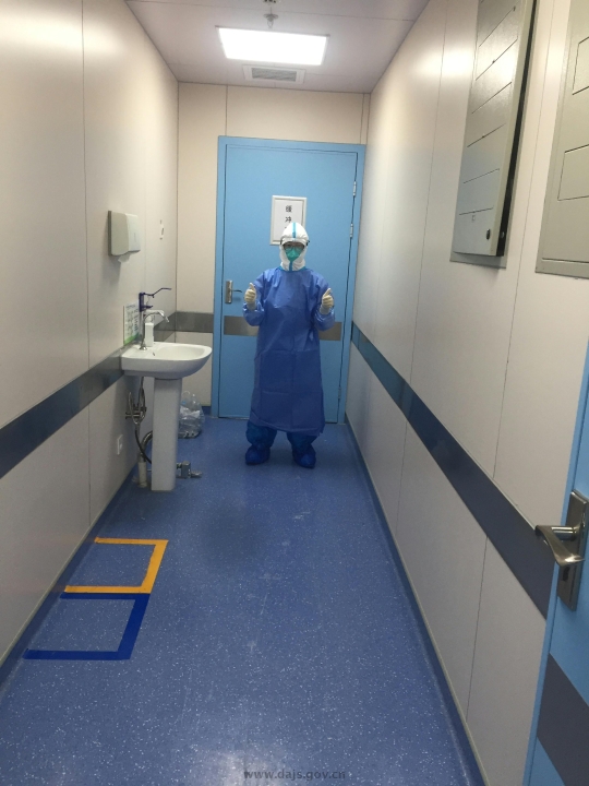 图为范萍整装待发,前往监护病房开始一天的工作