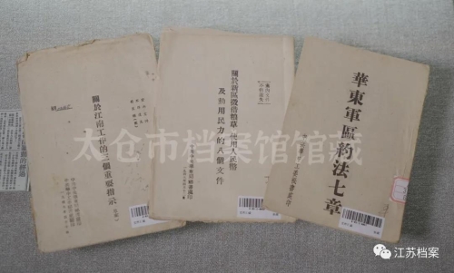 党的七届二中全会后,党中央下达了一系列文件,对全国解放的各项工作作了重要指示。太仓市档案馆还保存着当时重要的三册文件汇编,文件主题分别是《关于江南工作的三个重要指示(草案)》《华东军区约法七章》《关于新区征借粮草、使用人民币及动用民力的八个文件》。其中在《中央关于新区征借粮草的规定》中就写明“征借之主要对象,为地主富农,其次为中农”,“凡征借之粮草,统由征借机关发给粮草票或预借证,以便将来向人民民主政府抵缴公粮田赋”。