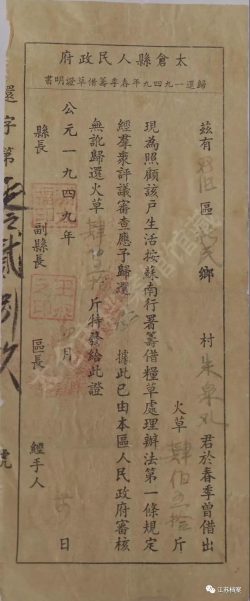 大家好,我是太仓市档案馆的红色珍档守护人嵇秋红。今天我要介绍的红色档案,是“太仓县人民政府归还1949年春季筹借草证明书”。