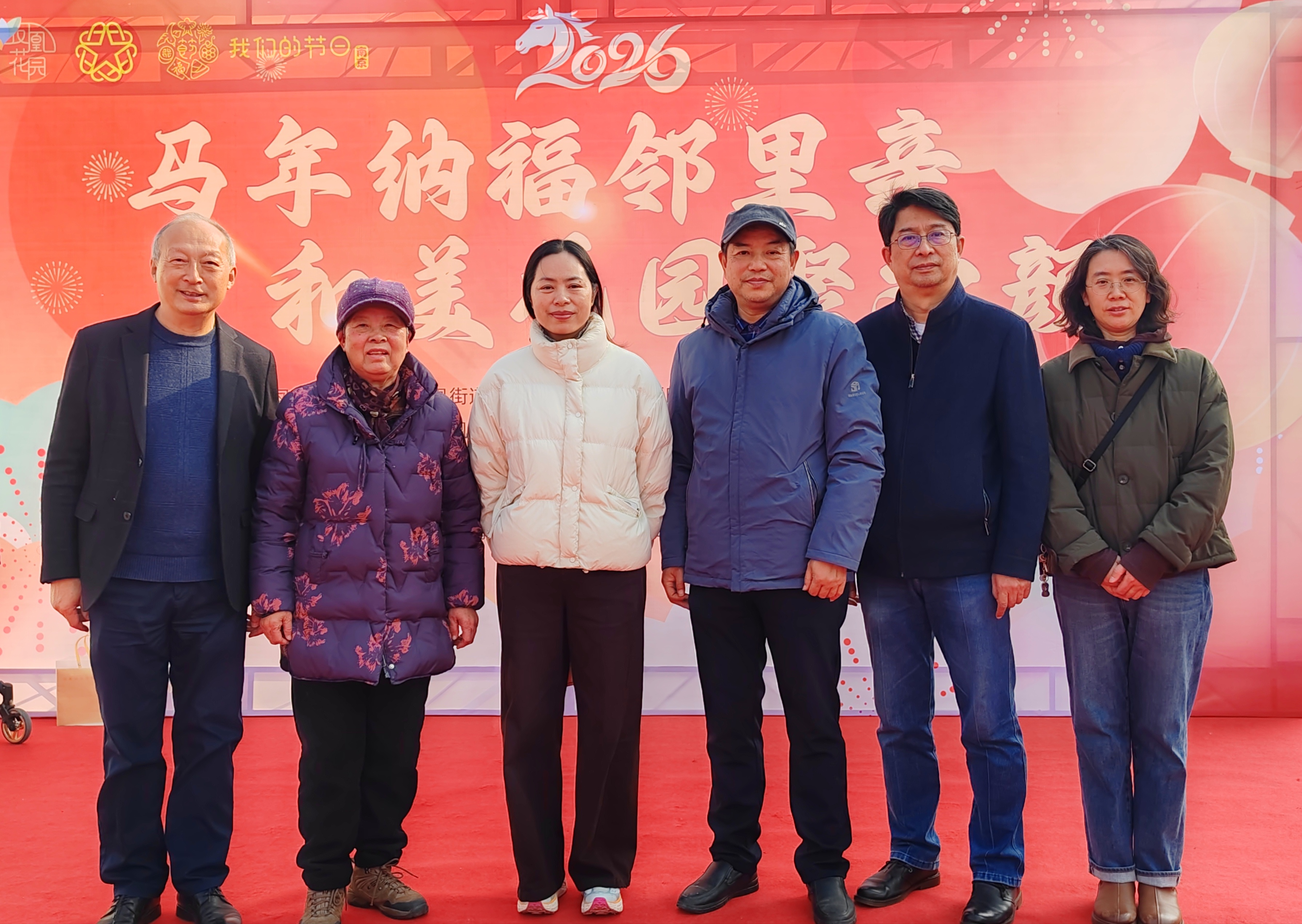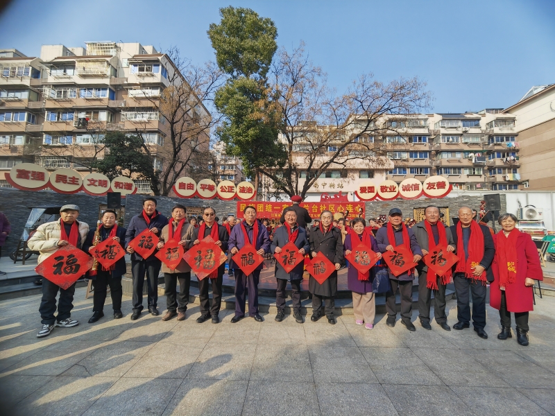 离退休干部第一党支部党员来到南京市鼓楼区凤凰街道凤凰花园社区附近的苏宁广场,与社区共同举办“马年纳福邻里亲 和美花园聚欢颜”迎新春主题活动。老同志们现场挥毫泼墨,笔走龙蛇间,一幅幅红底墨字的“福”字跃然纸上,浓郁的墨香扑面而来。