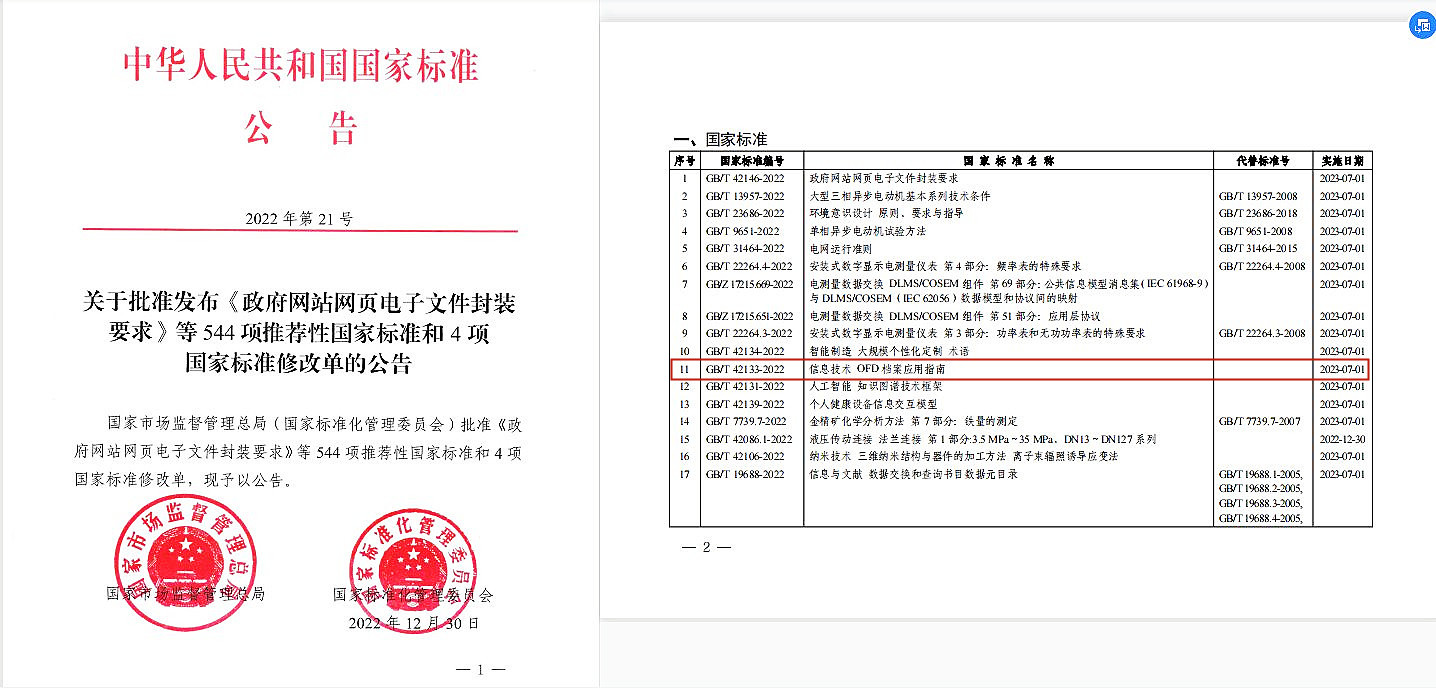 2022年12月30日,国家市场监督管理总局和国家标准化管理委员会联合印发国家标准2022年第21号公告,批准发布《政府网站网页电文文件封闭要求》等544项推荐性国家标准,省档案馆参与研制的《信息技术 OFD档案应用指南》(GB/T 42133-2022)位列其中。