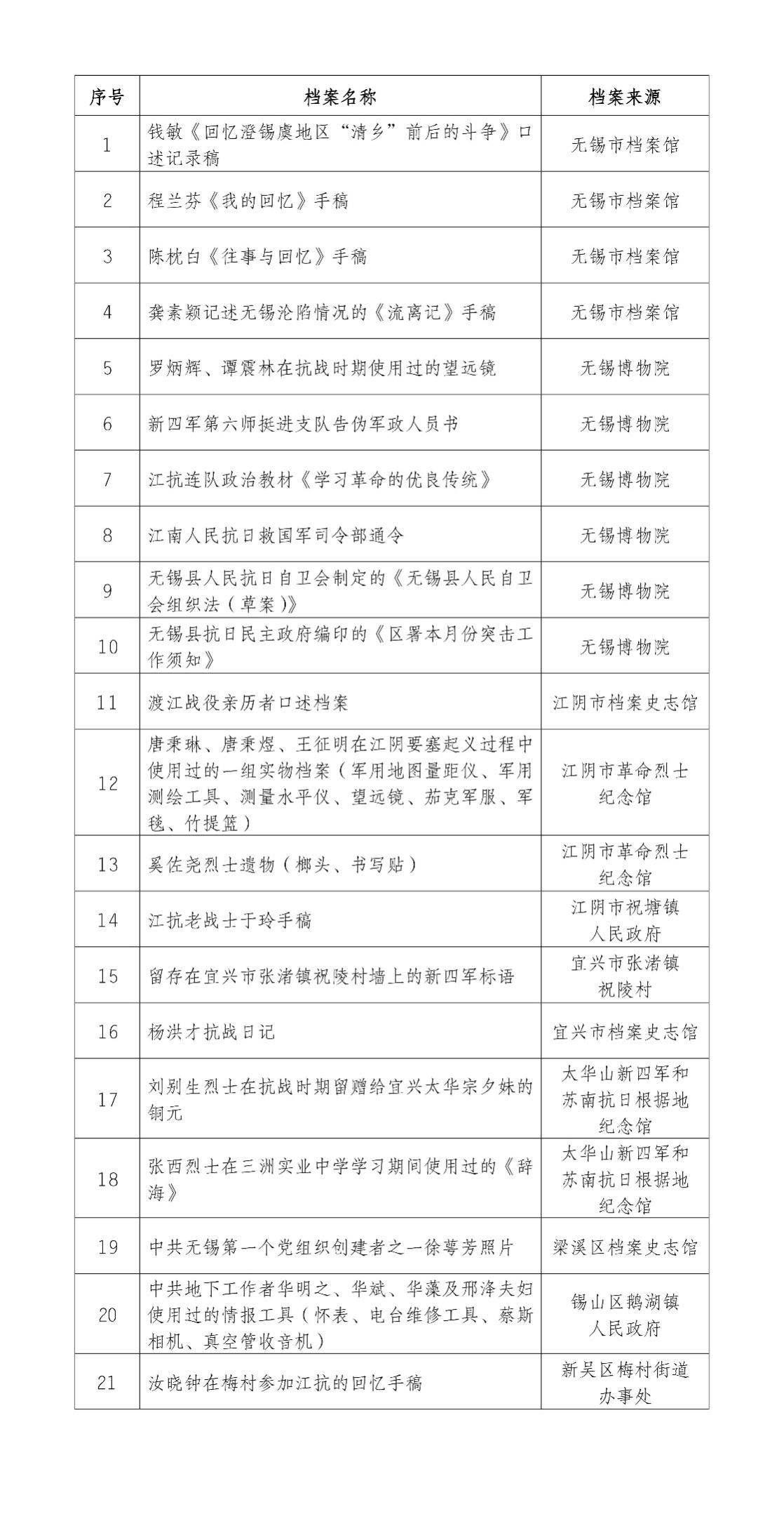 《无锡市第二批红色珍贵档案名录》具体名单如下(排名不分先后):